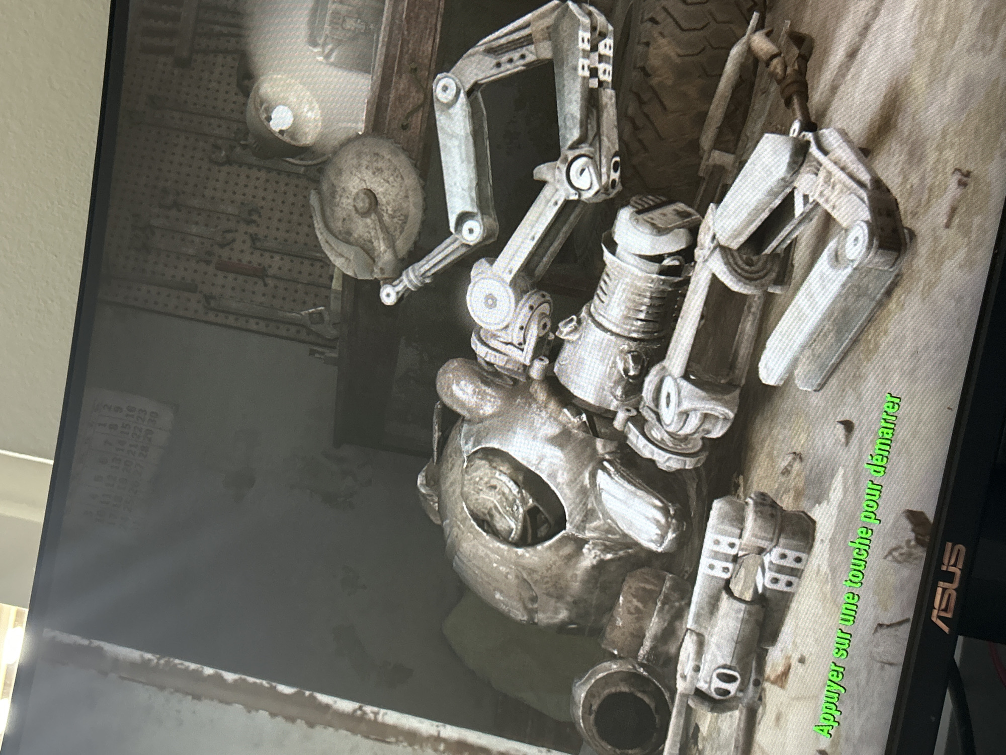 close-up of a partially assembled or disassembled robot, possibly a video game asset, lying on a surface. The robot's head and torso are visible, along with robotic arms and other mechanical components. The parts are metallic and appear worn or weathered. In the background, there is a cluttered workbench with tools and other objects on a pegboard. A calendar hangs on the wall to the left. There is green text at the bottom of the image which is in French. An ASUS monitor is to the right of the image. This scene does not appear to be a real-world location in Strasbourg, France, but rather a screenshot or digital rendering.