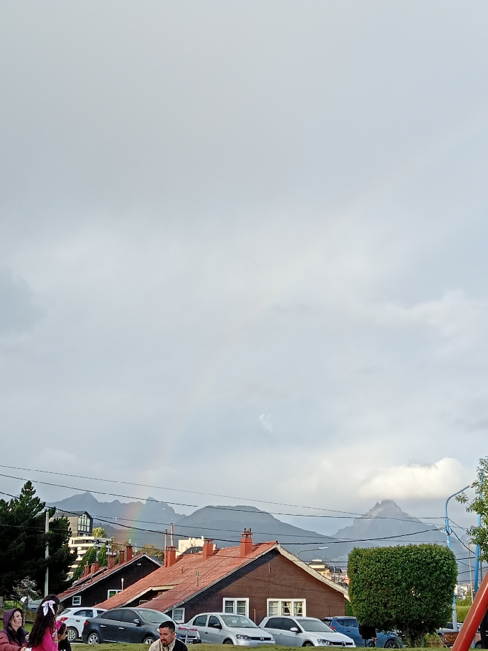 Overcast day scene featuring a row of brown houses with red roofs, backed by mountains. A faint rainbow arcs in the distance, partially obscured by the mountain range. Cars are parked along the street in front of the houses. A few people stand or sit near the leftmost edge of the frame. A bush and lamppost are visible to the right.