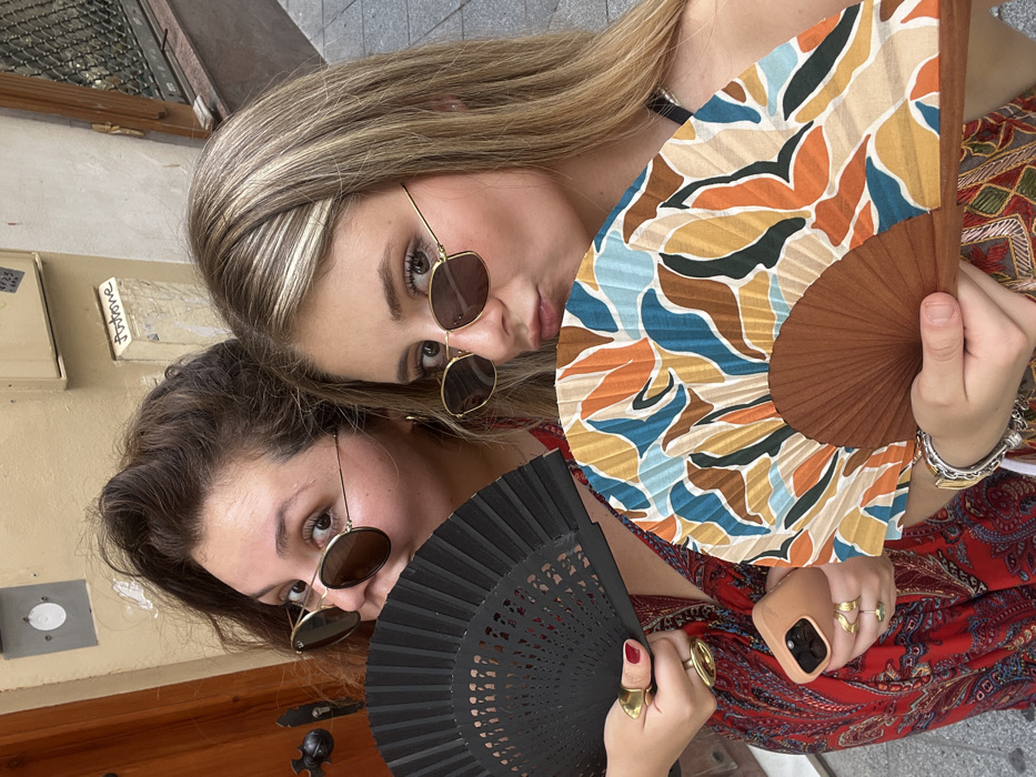 Two young women pose for a selfie, leaning close to each other. One has blonde hair and wears gold-rimmed sunglasses, while the other has brown hair and similar sunglasses. They each hold a fan; one fan is black, and the other is patterned with blue, orange, and brown. The blonde woman wears a red patterned dress. Visible on their hands are multiple rings and a phone in a neutral case. They are positioned against an exterior building wall.