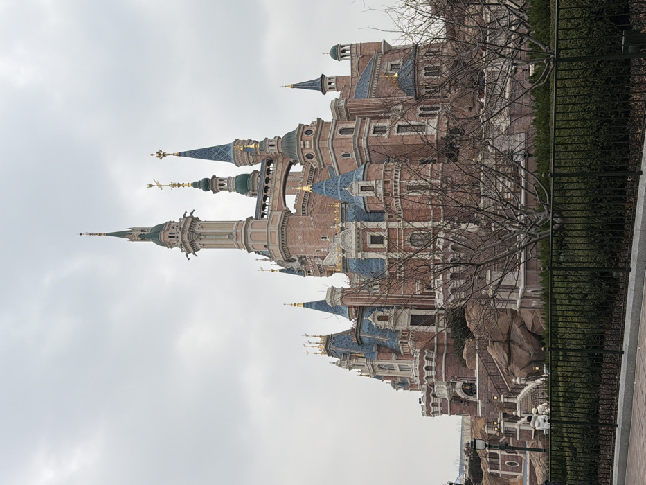 A tall, ornate castle with multiple turrets and spires stands against a gray sky