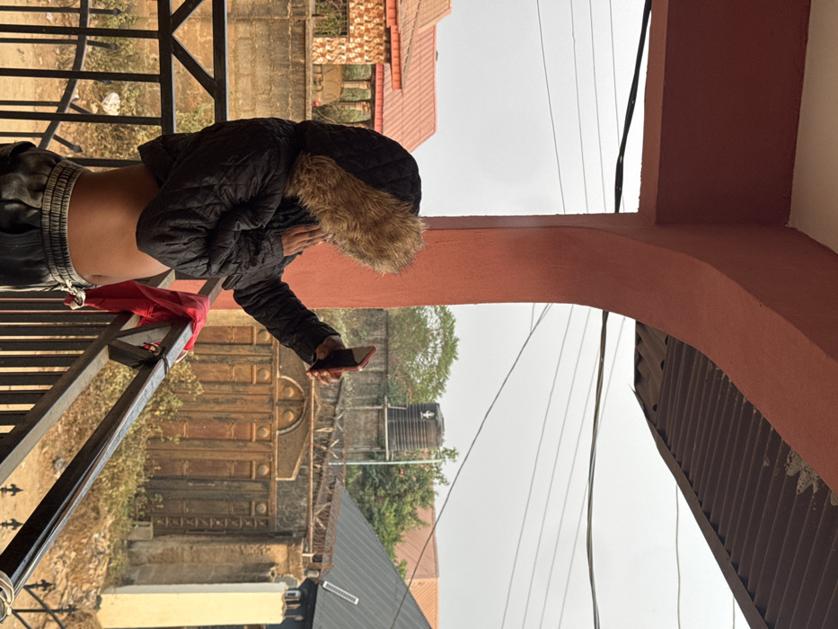 An individual stands on a balcony, partially unclothed with a jacket, holding a phone