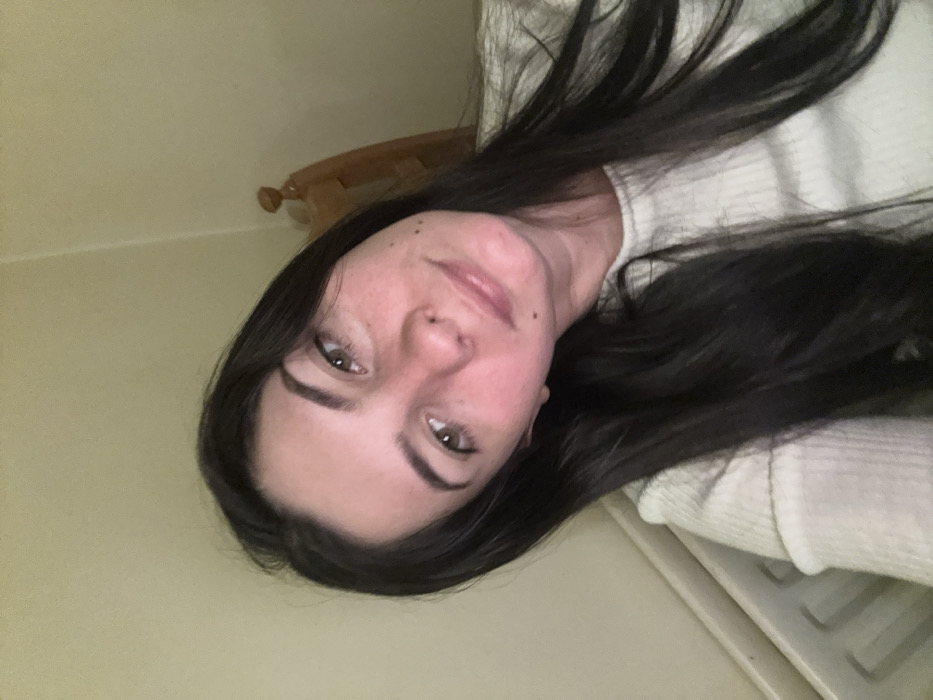 The image displays a close-up, angled selfie of a young adult female indoors, located in Shrewsbury, United Kingdom as specified