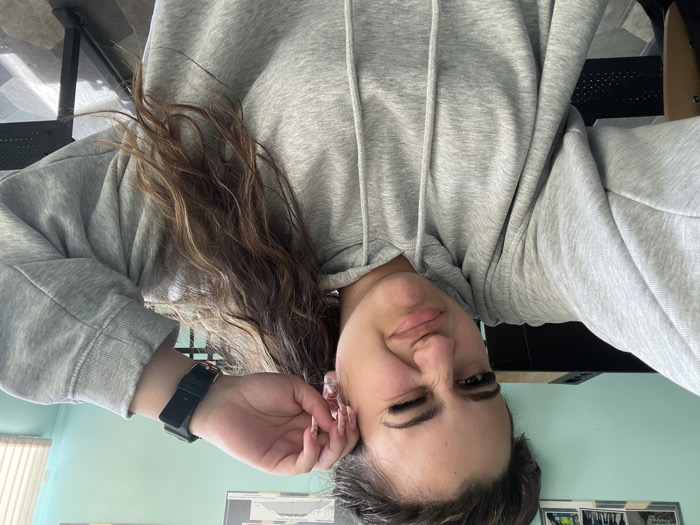 The image is an indoor selfie featuring a single female individual from the chest up, centered in the frame. She has medium-length, wavy dark brown hair with lighter highlights, predominantly cascading over her left shoulder. She wears a grey hooded sweatshirt. Her facial expression is a playful grimace, with her right eye winking shut, her left eye squinted, and her mouth forming a slight pout with pursed lips. Her right hand is raised, with fingers near her right earlobe, where a small silver-colored stud earring is visible. A black digital watch with a dark strap is worn on her left wrist. The background features a light teal-green painted wall. On the wall to the upper left, two framed items are visible: one appears to be a multi-panel photographic display, and the other a white chart or diagram with dark markings. A dark-colored desk or table is partially visible on the left side, and a dark metal chair frame is seen on the right. Vertical blinds are visible in the upper right, suggesting a window. The specific location within Veliko Tarnovo, Bulgaria, cannot be determined from the visual evidence present in the image.