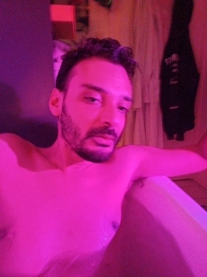 A man is photographed from the chest up, seemingly in a bathtub. Bathed in pink lighting, he has dark hair, a beard, and a mustache. A cabinet is visible in the background, as well as an item of dark clothing hanging behind him. He appears relaxed.