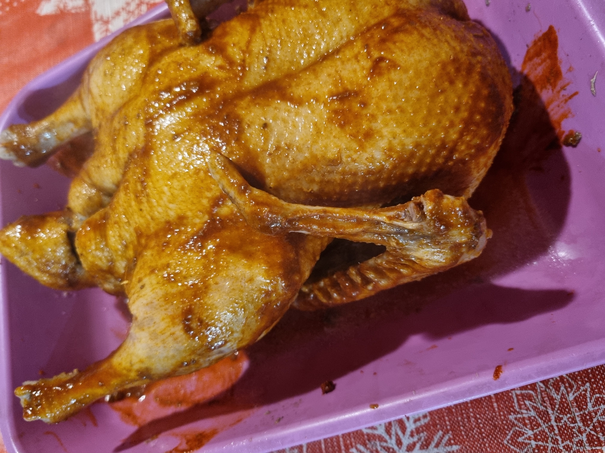 - "The image depicts a roasted whole duck, glazed with a dark brown sauce, sitting in a light purple baking dish" by FM-Wjqd93, licensed under CC BY 4.0