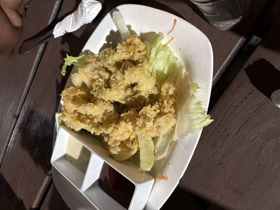This image captures a close-up, dimly lit scene at a restaurant table in Roatán, Honduras, likely during evening hours