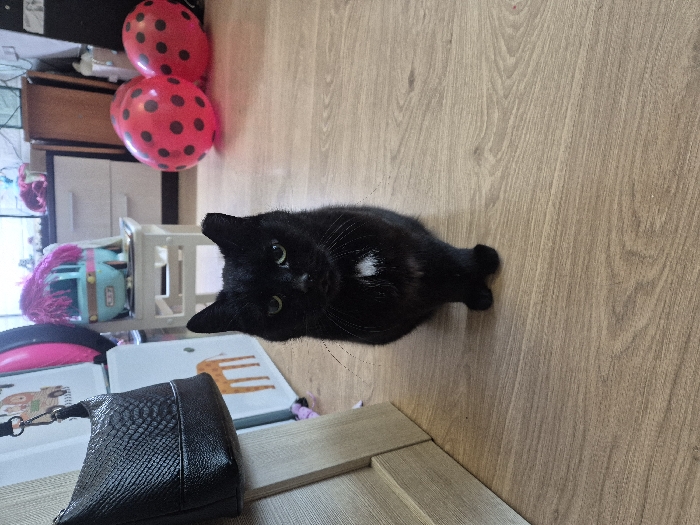 This image depicts an indoor domestic scene in Saint Petersburg, Russia. The central subject is a black domestic cat, positioned upright on a light brown laminate floor, facing directly towards the viewer. The cat possesses short black fur, bright green eyes, visible whiskers, and a small white patch of fur on its upper chest. Its front paws are tucked beneath its body. In the background to the left, a black faux-leather shoulder bag with a textured surface hangs alongside a light-colored wooden door frame or panel. Behind this, a white surface displays a brown giraffe illustration. To the right of the cat, further in the background, two large, round, red balloons with black polka dots are resting on the floor. A small white stool, topped with a light blue toy vehicle featuring a pink, fluffy cover, is situated behind the cat to the right. White kitchen-style cabinetry or storage units are partially visible in the distant background. The overall environment appears to be a well-lit residential area.