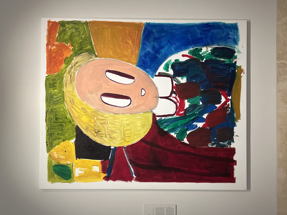 A large, vibrant, abstract-expressionist painting is displayed on a smooth, light gray wall within an art gallery in Madrid, Spain. The artwork features a highly stylized, frontal portrait of a figure, possibly a child, with an oval, light peach-toned face, two prominent white oval eyes with dark pupils, and a small black line forming a smiling mouth. The figure has textured, bright yellow hair and wears a patterned dress with a white rounded collar, rendered in thick, blocky strokes of dark green, deep red, blue, and dark brown. The background is divided into abstract color fields: green and yellow in the upper left, orange and green in the upper right, dark red along the left side, and solid blue along the right side. The painting exhibits distinct, visible brushstrokes. A white information plaque with black text is affixed to the wall to the left of the artwork. The floor visible at the bottom of the frame is a light beige or tan, possibly marble. The scene is illuminated by even, diffuse lighting.