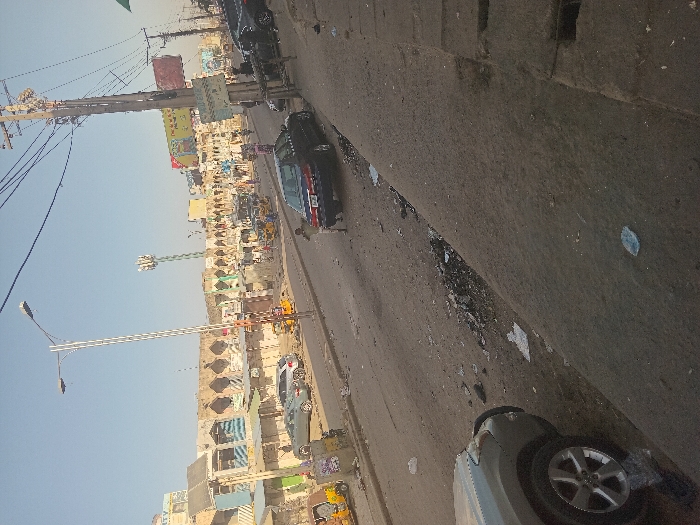 A street scene shows a mix of vehicles including cars and motorcycles. A large, weathered building lines one side of the street, with utility poles and wires overhead. Litter is scattered along the curb. Street lights stand along the side. The image is slightly angled, with the view receding into the distance where activity and structures appear dense.