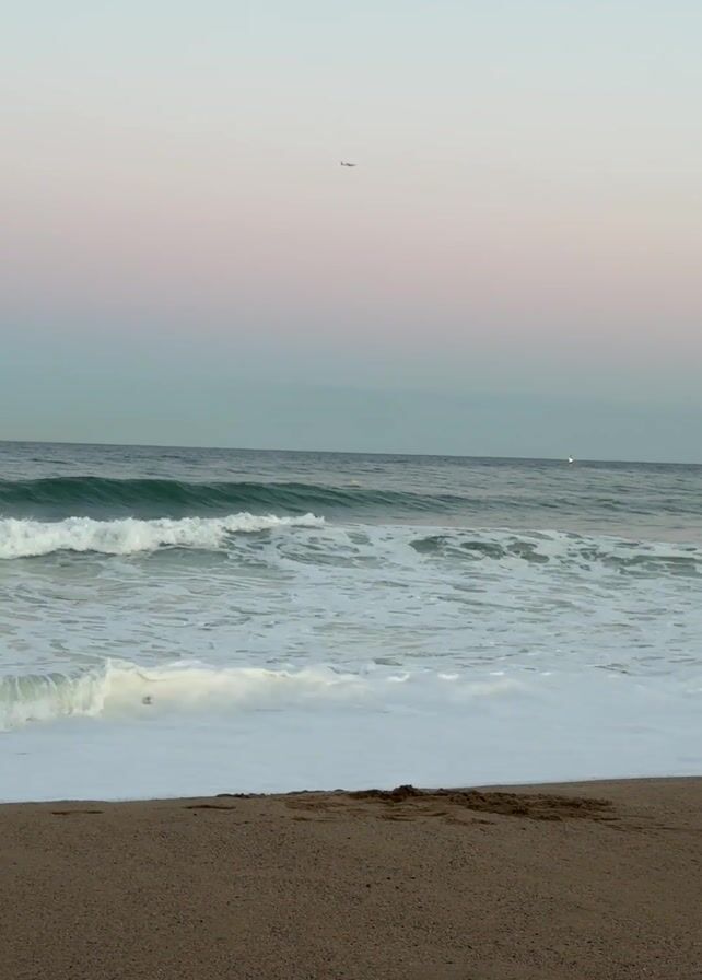 The video depicts a beach scene with a light tan sand and ocean waves rolling in. A person is surfing in the distance, catching a wave, and there is a boat further out on the water. The sky is a blend of light blue, gray, and hints of pink, suggesting either sunrise or sunset. A small airplane is visible in the sky.