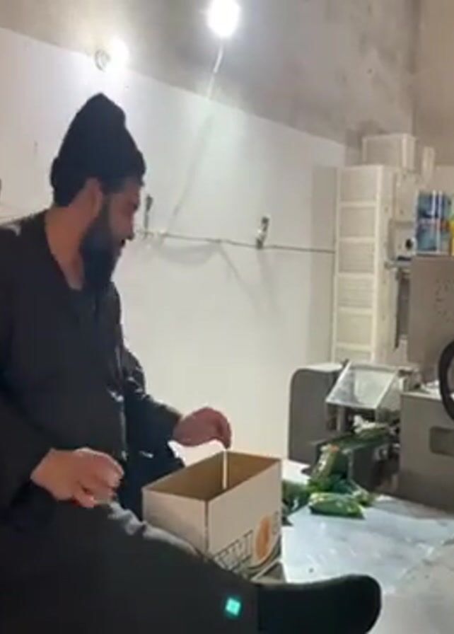 The scene is a food packing facility. Four men are present, three wearing hairnets and masks, and one wearing a black hat and a long black shirt. He is sitting on the edge of a conveyor belt and placing small, green packages into a box labeled "KIMI." Two other men are doing the same while standing at the conveyor belt. The fourth man is standing near a machine that is likely used for packaging. Boxes labeled "KIMI" are stacked on the left side of the room. The room has fluorescent lighting and appears to be a clean, industrial setting.