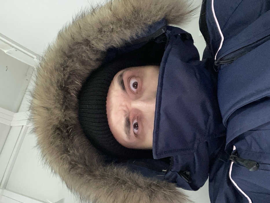 The image, taken in Luzhitsy, Russia, presents a close-up, upward-angled view of an individual from the chest up. The person is wearing a dark blue winter parka featuring a natural fur-trimmed hood and a black knit beanie. The parka's collar is pulled high, concealing the lower portion of the face. Only the individual's eyes and forehead are visible. The eyes are wide, pupils appear dilated, and the eyebrows are furrowed, conveying an expression of alarm or intense focus, with a slight inward deviation of gaze. The background is a plain, light-colored ceiling with visible white structural beams.