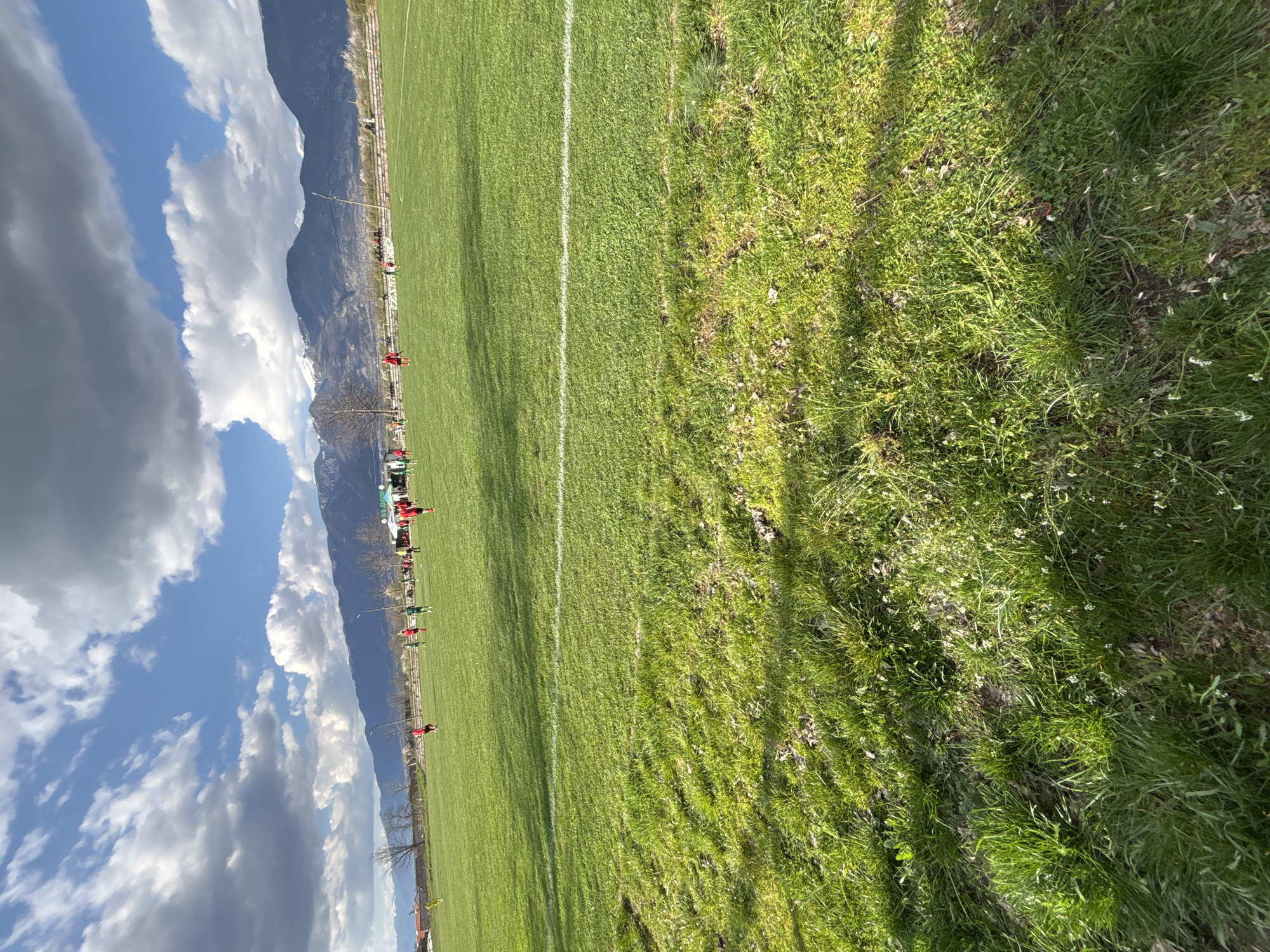 The image depicts a grassy field with a white line marking a boundary, possibly a soccer field. In the background are mountains, and a sky with cumulus clouds. There appear to be people standing along the side of the field. The location is Dabene, Bulgaria.