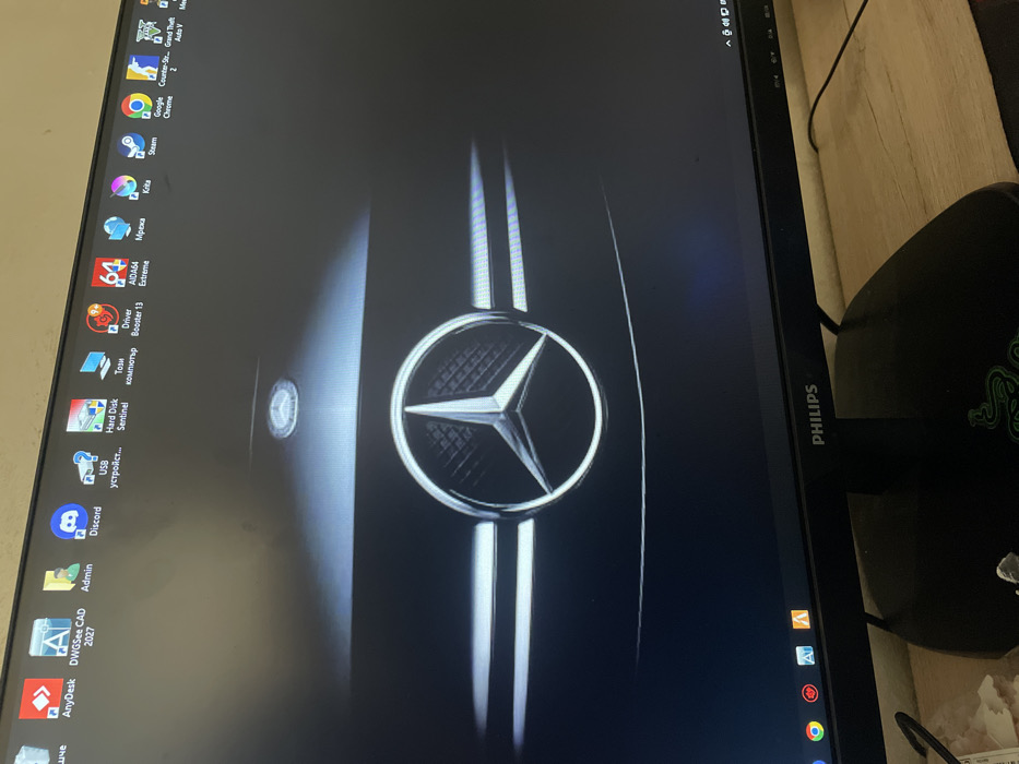 A Philips computer monitor displays a desktop environment indoors. The screen features a dark wallpaper depicting a silver Mercedes-Benz three-pointed star logo on a black background, with horizontal chrome lines extending from the emblem. A smaller Mercedes-Benz badge is visible at the top center of the wallpaper. The desktop's upper portion contains multiple application shortcuts and folders, including AnyDesk, DWGSee CAD 2027, Admin, Discord, "USB устройство..." (USB device...), Hard Disk Sentinel, "Този компютър" (This PC), Driver Booster 13, AIDA64 Extreme, "Мрежа" (Network), Krita, Steam, Google Chrome, Counter-Strike 2, Grand Theft V, and Auto V. A segment of the Windows taskbar is visible at the bottom of the screen. The monitor rests on a light-colored wooden desk surface. A black circular monitor stand is visible, and a black mousepad with a green Razer logo is partially visible beneath the stand. A black cable extends from the left side of the desk. The background consists of a plain, light-colored wall. This scene is located within Cherven Bryag, Bulgaria.