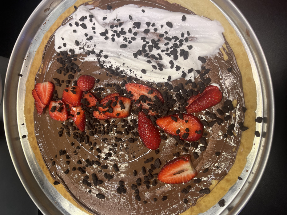 A circular dessert is presented on a silver-colored metal tray with a raised rim. The dessert features a thin, golden-brown base, fully covered with a thick, glossy layer of dark brown chocolate-hazelnut spread. The right side of the dessert, covering approximately one-third to half of its surface, is topped with a generous portion of white whipped cream. Scattered across both the chocolate spread and the whipped cream are numerous dark, irregularly shaped cookie crumbs. Bright red, fresh strawberry slices and a few smaller whole strawberries are arranged primarily over the chocolate spread. The tray rests on a dark, non-reflective surface. A faint, blurry lighter object is visible in the upper left background, suggesting an indoor setting. No individuals or specific actions are depicted. The image does not contain any visual identifiers for a specific location within the city of Burgas, Bulgaria.