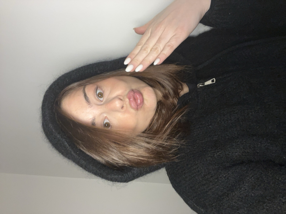 A woman in a black hooded sweater poses for a selfie. She is looking at the camera with pouty lips and wide eyes. Her hand is raised and angled above her head, displaying light-colored manicured nails. Brown hair is visible from under the hood. The background is plain white. The image is rotated sideways. A metal zipper is visible on the sweater.