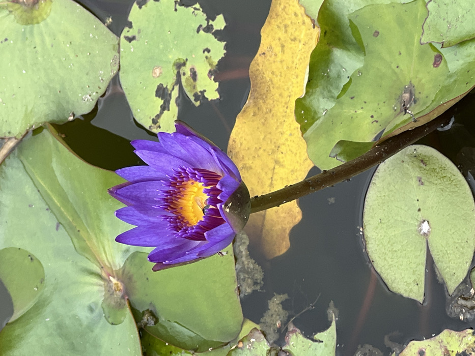 A vibrant purple water lily with a yellow center blooms among green and yellow lily pads floating on dark water. Some pads exhibit signs of decay and holes, while others are healthy. A thin, dark stem connects the blossom to its underwater roots. The composition is focused on the flower and its surrounding foliage.