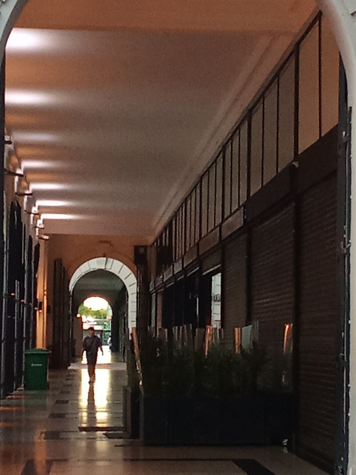 An indoor passageway features a man walking towards the viewer. Arched entrances line the left, punctuated by wall-mounted lights, while closed storefronts occupy the right. Planters stand in front of these stores. Light reflects off the polished floor creating a bright path. The space is enclosed, with a vaulted ceiling.