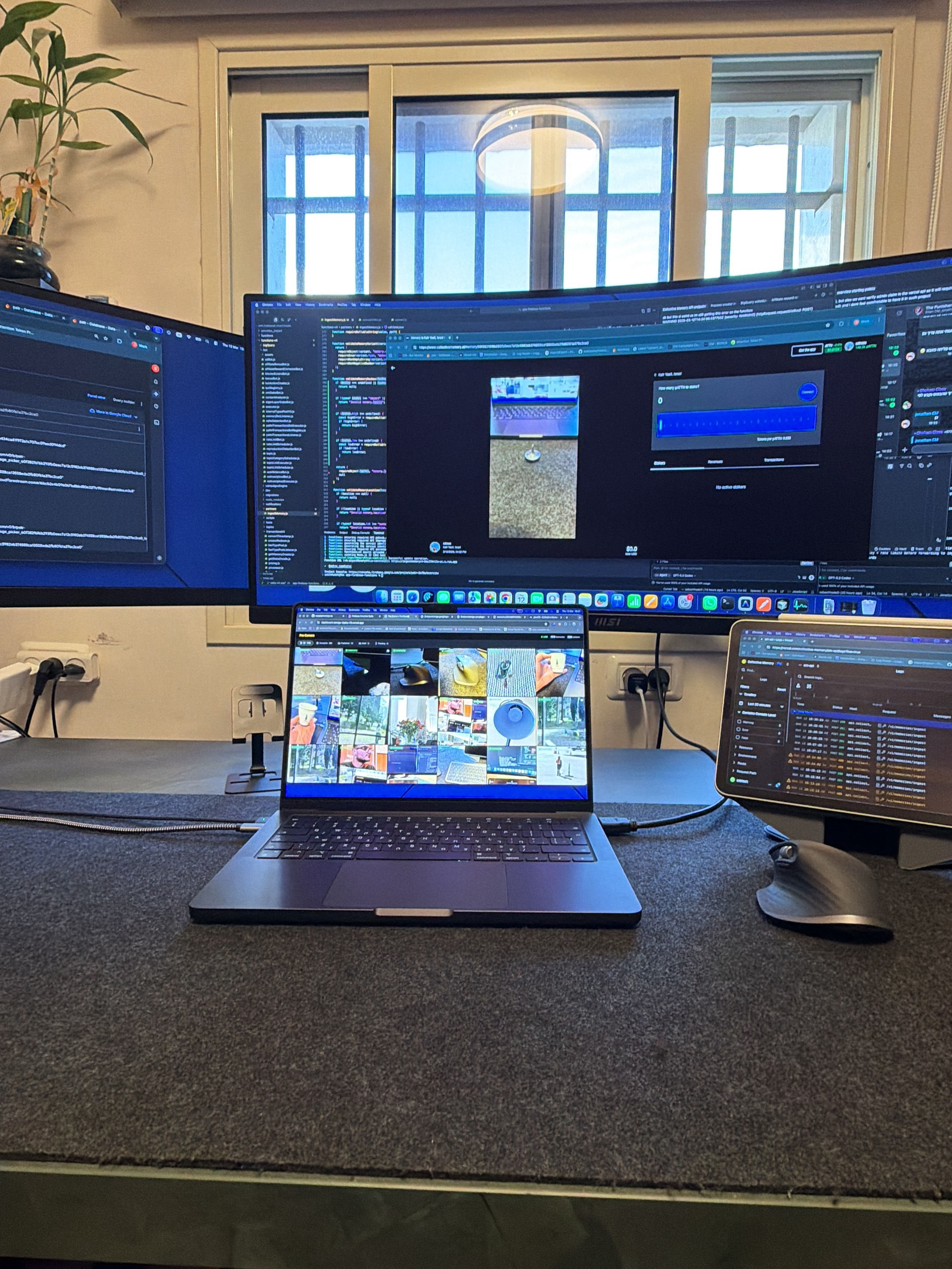 The scene depicts an indoor computer workstation located in Kafr Yasif, Israel. The workstation is set against a wall with two large windows in the background, revealing a bright sky and a distant structure. On the far left, a green leafy plant is situated in a dark vase. The primary setup consists of three active screens and a peripheral. From left to right: 1. A vertical external monitor displays lines of code or text on a dark background. 2. A large, curved central external monitor also displays code or text on its left side and a graphical user interface on its right. The interface shows a vertically oriented image of a phone screen above a textured surface, alongside a panel with blue input fields and buttons. 3. A dark-colored laptop, open and positioned centrally on a desk, displays a grid of approximately twenty-five small thumbnail images. 4. To the right of the laptop, a tablet screen stands upright, displaying what appears to be a timeline or data table with multiple rows and columns. 5. An ergonomic, dark gray computer mouse rests to the right of the tablet. The desk surface is covered with a dark gray, felt-like material. Visible in the background are white wall outlets and black cables connecting the electronic devices. No individuals are present in the image, and no specific human actions or interactions are depicted.