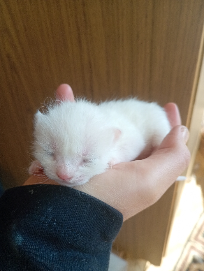 - "A small, white, neonatal feline, with closed eyes and visible pink facial features, is held motionless in the open palm of an adult human hand" by FM-75hZp2, licensed under CC BY 4.0