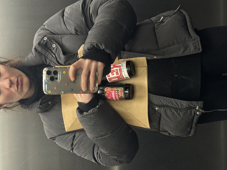 A person in a puffy black jacket holds a phone with a floral case. The phone faces the camera. The person appears to be taking a selfie in a mirror. A brown paper bag rests on the person's stomach and contains two jars. One jar has a red label with the word "LINDEGAARD" printed on it, while the other jar has a white label with the letters "LEF" visible. The person wears a black turtleneck sweater beneath the jacket.