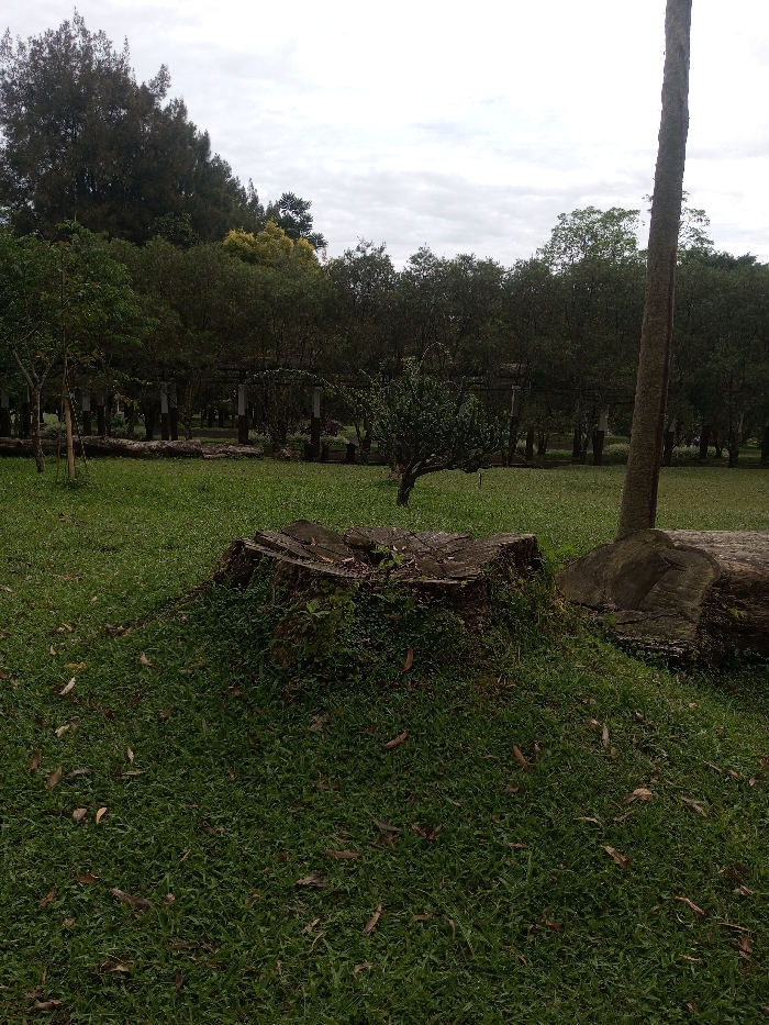 A grassy field contains a weathered tree stump adorned with greenery and fallen leaves. A solitary, upright trunk stands nearby, accompanied by a large log. In the background, a line of trees stretches across the horizon under a cloudy sky, with a pergola visible among them. The scene evokes a tranquil, natural setting.