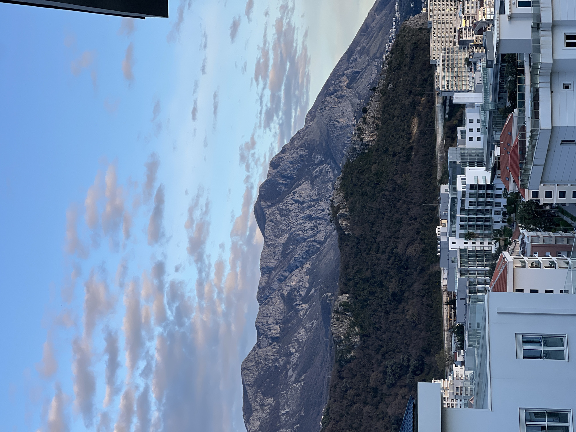 vertical view of a landscape. On the right, a cluster of buildings, primarily white, with some red roofs, signifies an urban area, potentially Boreti, Montenegro. The left showcases a rugged, steep mountain with exposed gray rock formations and patches of dense, dark green forest covering the lower portions. The sky is visible at the top, featuring a blue gradient with light gray and pink clouds. The image orientation appears to be rotated 90 degrees.