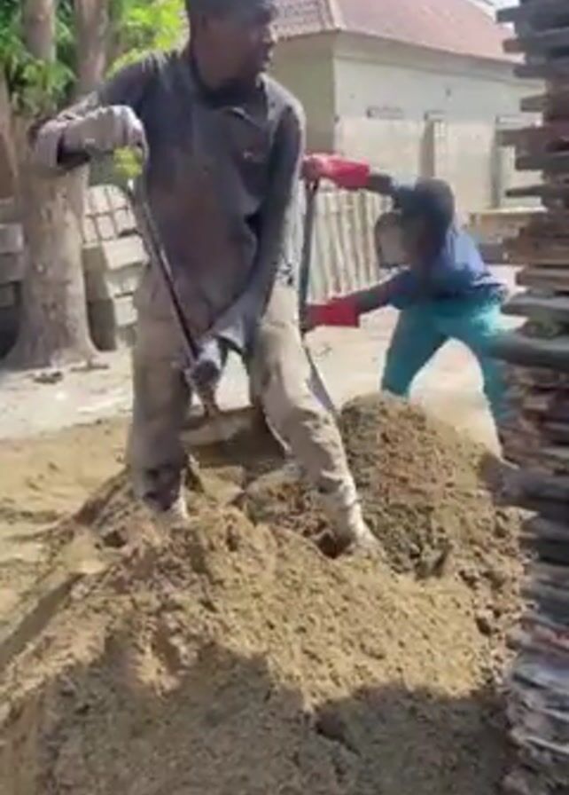 Two men are working on a construction site outdoors. One man, dressed in a long-sleeved shirt and trousers, is shoveling sand from a large pile. The other man, wearing a blue shirt and aqua trousers, is working in the background. Stacks of wooden boards and concrete blocks surround the men. A large blue barrel filled with water sits next to the pile of sand. A building with a reddish-brown roof is visible in the background, along with a tree.