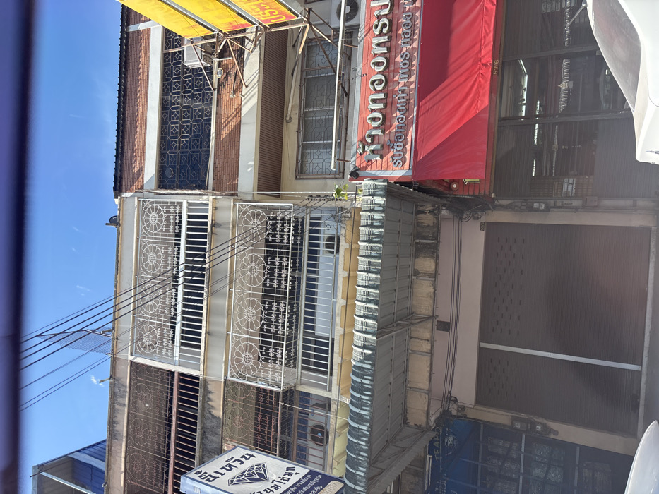 A multi-story building is seen in a vertical composition. A yellow sign with Thai characters is atop the building. A red awning with white text in Thai and English is visible on the right. Windows with ornate ironwork are stacked vertically. Power lines crisscross in front of the building. A blue sign with Thai text is at the bottom. Other commercial buildings adjoin this one.