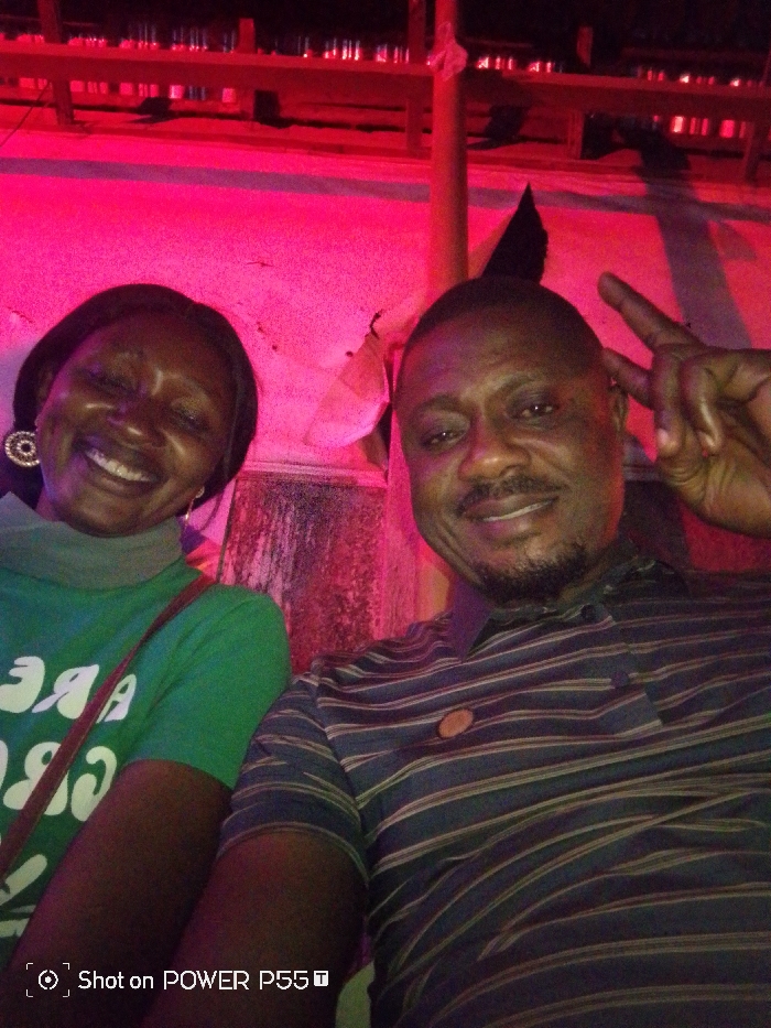 A selfie captures two people under red lighting. On the left, a smiling woman in a green t-shirt and gray scarf wears a large earring. To her right, a man in a striped polo shirt smiles and gives a peace sign. They appear to be indoors, possibly a bar or restaurant, with wooden rafters visible behind them. The photo was taken with a POWER P55T phone, with the watermark in the bottom left corner.