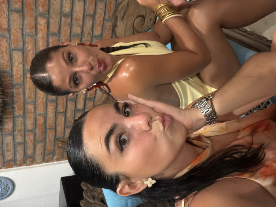 Two adult females are positioned for a photograph in an indoor or semi-outdoor setting in Pecatu, Indonesia