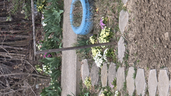 The image displays an outdoor garden scene at an unknown location in Unknown, Unknown. The foreground features freshly tilled brown earth on the right, adjacent to a winding path composed of light gray, irregularly shaped hexagonal stepping stones on the left. Sparse green grass and dry vegetation are visible between the stones. Clumps of primrose-like flowering plants in white, pale yellow, and a single pink specimen are scattered along the path and surrounding soil. A slender, vertical, light brown wooden stake is positioned centrally within a patch of greenery. In the midground, a light blue painted car tire is repurposed as a planter, containing dry, reedy vegetation. More white and yellow flowering plants, alongside broad-leafed green plants, are present. A flat, horizontal concrete pathway extends across the upper midground. The background is dominated by a dense cluster of bare deciduous trees and shrubs with visible branches, suggesting early spring conditions. Patches of white, yellow, and purple flowers are discernible beneath the trees. A dark, indeterminate fence or barrier structure is faintly visible behind the trees and vegetation.