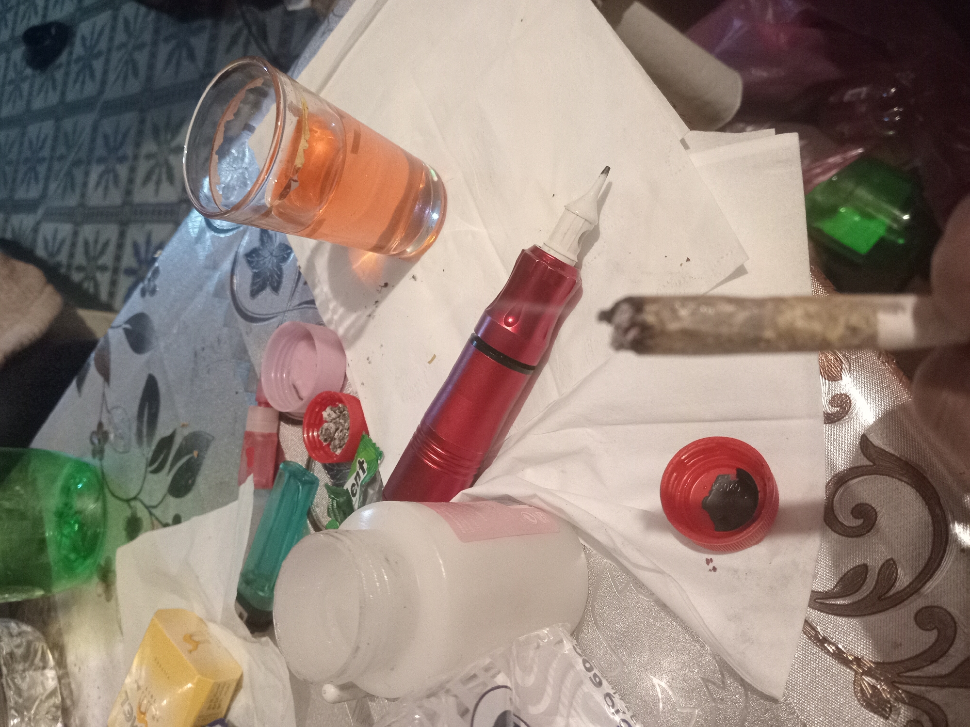 tabletop littered with various items. There is a partially full shot glass of amber liquid, a red tattoo machine, a white bottle with a pink label, a lit joint held by a hand partially visible in the frame, and several bottle caps (red and pink) scattered across a white napkin. Other objects include a box of cigarettes, a green bottle, and what appear to be used tissue or wipes. The setting appears to be an indoor space with a patterned tablecloth. The city is unknown.