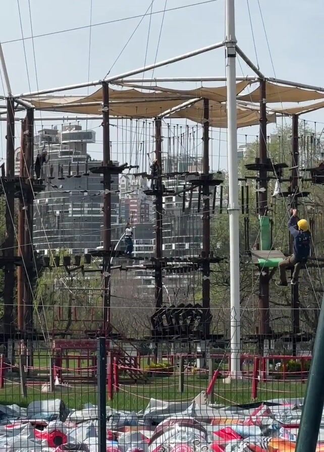 n outdoor high ropes course with multiple participants navigating various elements. The course is constructed from wooden beams, metal poles, and rope, with platforms at different heights. Several people are visible on the course, wearing safety harnesses and helmets. They are moving along the ropes, bridges, and platforms, some of them using zip lines. In the background, there are buildings and trees. Below the course is a safety net filled with red, white, and gray cushions. A child's swing is visible in the foreground. The sky is partly cloudy.
