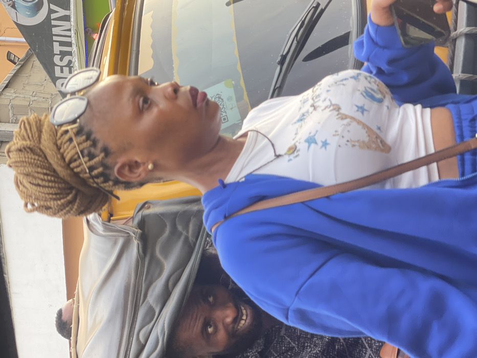An outdoor scene in Asaba, Nigeria, depicts three individuals and multiple vehicles under daylight conditions. In the foreground, a dark-skinned woman with blonde box braids styled in an updo stands or walks, facing towards the right. She wears sunglasses on her head, small gold stud earrings, a white short-sleeved crop top with blue and gold graphic designs, a blue open hooded jacket, and blue sweatpants. A brown shoulder bag strap crosses her body, and she holds a black smartphone in her left hand. Her expression is neutral. Behind and to the left of the woman, partially obscured by a dark vehicle interior or covering, a dark-skinned man with a beard is visible, smiling broadly with his teeth exposed, looking towards the woman. He wears a dark, patterned shirt. In the far upper left, the top of another person's head is faintly visible. To the right of the foreground woman, the front portion of a yellow tricycle taxi (keke Napep) is prominent, displaying a windshield with a visible QR code sticker. In the upper right background, a partial sign with the word "DESTINY" and other graphical elements is discernible, indicating a commercial establishment. A light-colored building wall is visible in the upper left background.