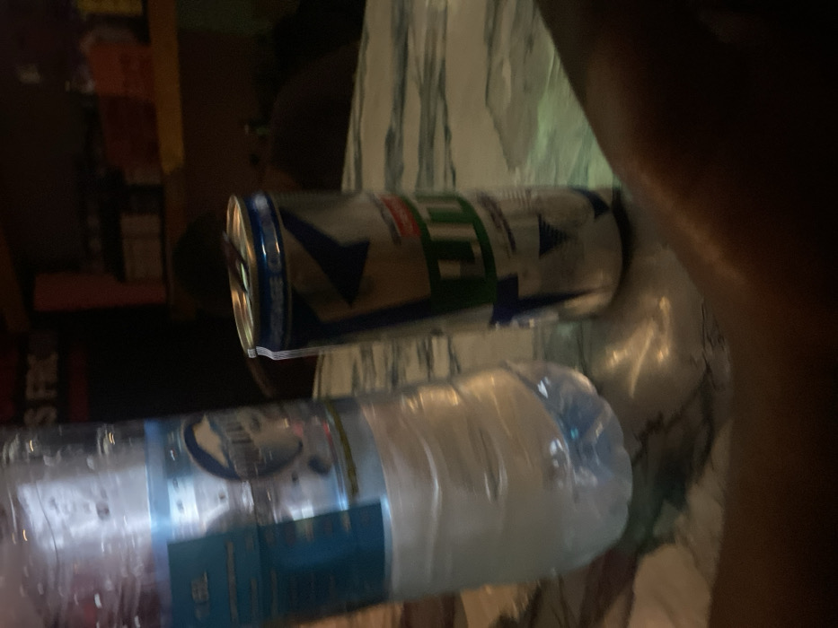 partially obscured view of two beverages on a table. The beverages are a blue-colored plastic bottle of water and a silver can with a blue and green label. The bottle is lying on its side, and the can is standing upright. The table appears to be made of a white marble-like material. The top of the table and the beverages are the only visible items in the image. The environment is dimly lit, making it difficult to discern any other details. The location is in Mbinga, Tanzania, at the coordinates -10.947 latitude and 34.997 longitude.