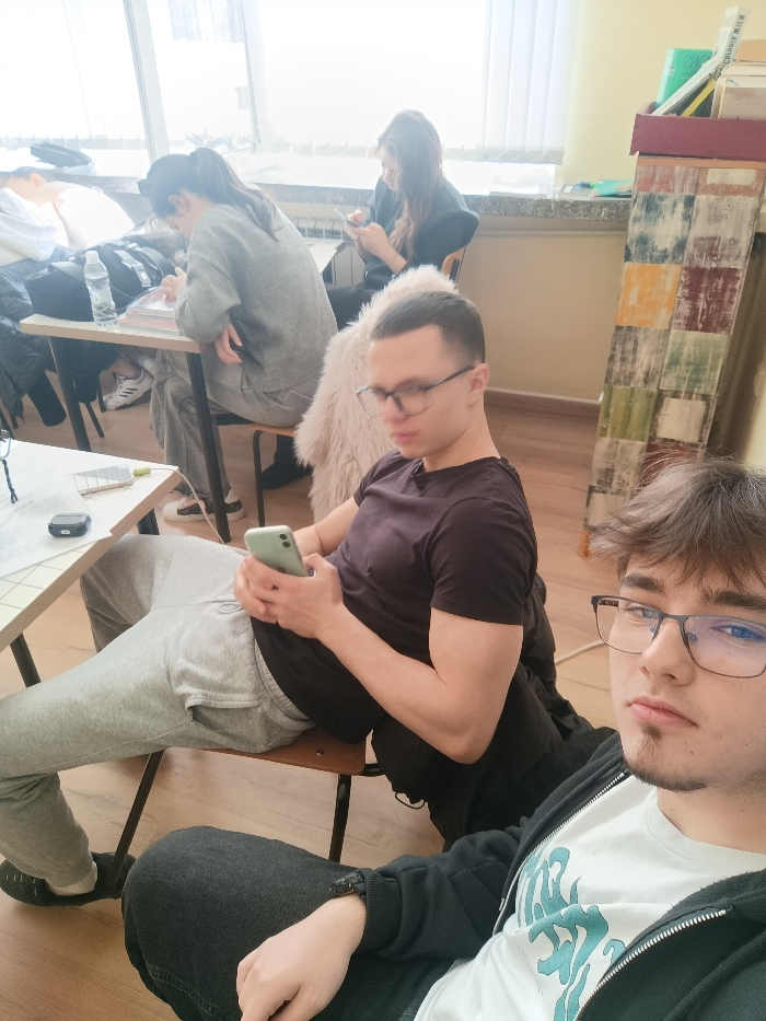The image depicts an indoor scene in Silistra, Bulgaria, featuring five young adults. In the immediate foreground, a male with dark, messy hair and glasses, wearing a black zippered hoodie over a white t-shirt with a light blue graphic, looks directly at the camera. Behind him and slightly to his left, another male with short dark hair and glasses sits on a wooden chair, wearing a dark short-sleeved t-shirt and gray sweatpants. He holds a light green smartphone with both hands, focusing on its screen. A light-colored furry item is draped over the back of his chair. On a light-colored desk in front of him are white papers, a black earbud case, and a small rectangular object. In the mid-background, to the left, a female with dark hair pulled back, wearing a gray long-sleeved top and gray pants, sits at a desk, seemingly engaged with papers. A clear plastic water bottle is on her desk. Further left and partially obscured, another individual in a white shirt is slumped or resting on a desk. To the right of the first working female, near a large window with white blinds, a second female with dark hair sits, also looking at a smartphone. The room features light-colored walls and a light wooden floor. A tall, narrow decorative panel composed of multicolored rectangular blocks stands vertically on the far right side of the room. Bright natural light enters from the window, causing some overexposure in the upper background. No direct interactions between the individuals are observable; most are engaged with personal devices or materials.
