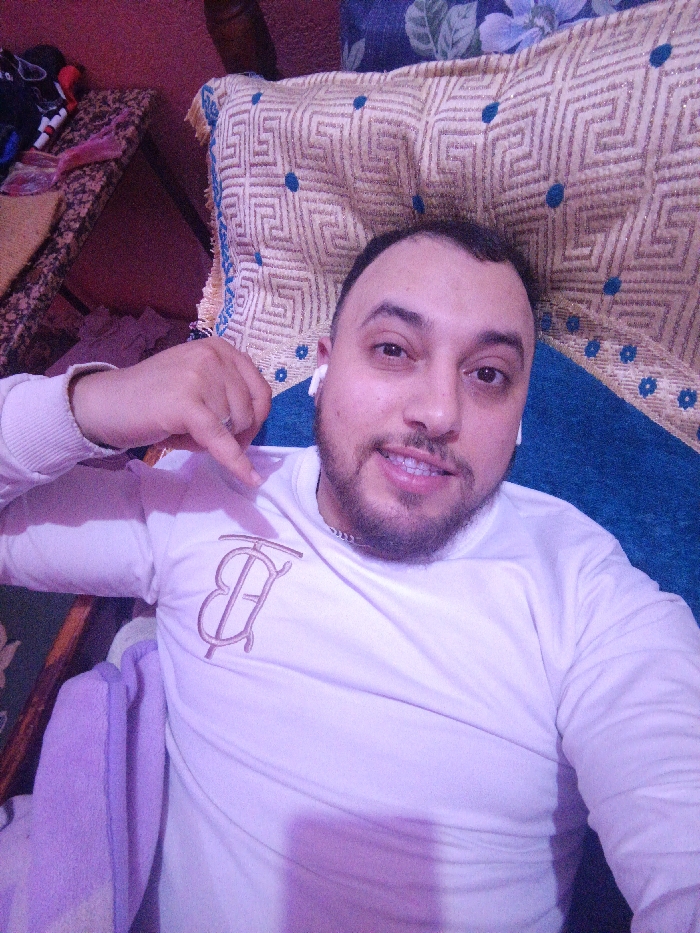 A man lies on a patterned blue and beige cushion. He points downward toward the "BJ" monogram on his white sweater. The man has short dark hair, a trimmed beard, and wears a small silver necklace and white wireless earbuds. A small table cluttered with items sits nearby. A purple blanket rests near his side. The lighting gives the scene a purple tint.