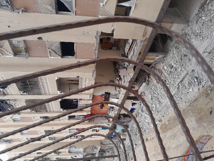 - "The image displays an urban scene in Khan Yunis, Palestinian Territory, characterized by extensive structural damage, viewed from an elevated perspective through a set of rusty, bent metal bars in the immediate foreground" by FM-V8KrL2, licensed under CC BY 4.0
