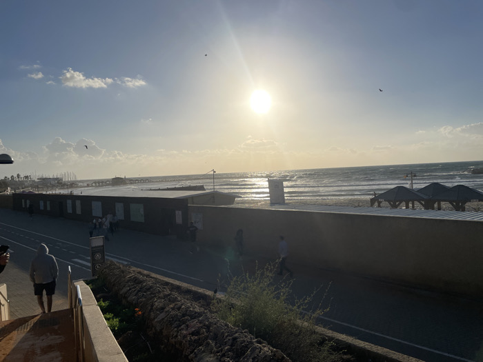 The image depicts a coastal scene under a bright sky with scattered cumulus clouds and the sun low on the horizon, causing significant lens flare and reflections on the water. The location is Unknown, Unknown. In the immediate foreground, a person in a grey hooded sweatshirt and dark shorts is seen descending a set of light-colored concrete stairs, with a dark railing partially visible to their right. Below the stairs and to the right, low-lying green vegetation and rocky ground are present. The midground features a paved pathway or road, marked with white lines, running parallel to the coastline. A prominent, dark-colored, solid wall, possibly a construction barrier or retaining wall, extends horizontally across the frame, separating the pathway from the beach. Several individuals are present on this pathway: a group of approximately three to four people are walking away from the camera near the center-left, and at least one other person is walking further right alongside the dark wall. A light-colored sign is affixed to the wall. In the background, beyond the wall and pathway, a sandy beach is visible, featuring two dark, inverted V-shaped structures, likely beach shelters or canopies. The beach meets a wavy ocean with whitecaps. A long pier extends into the ocean on the left side of the frame, and behind it, multiple masts from boats suggest the presence of a marina or harbor. The sky is blue with scattered clouds, and several small, dark avian silhouettes are discernible against the bright expanse.