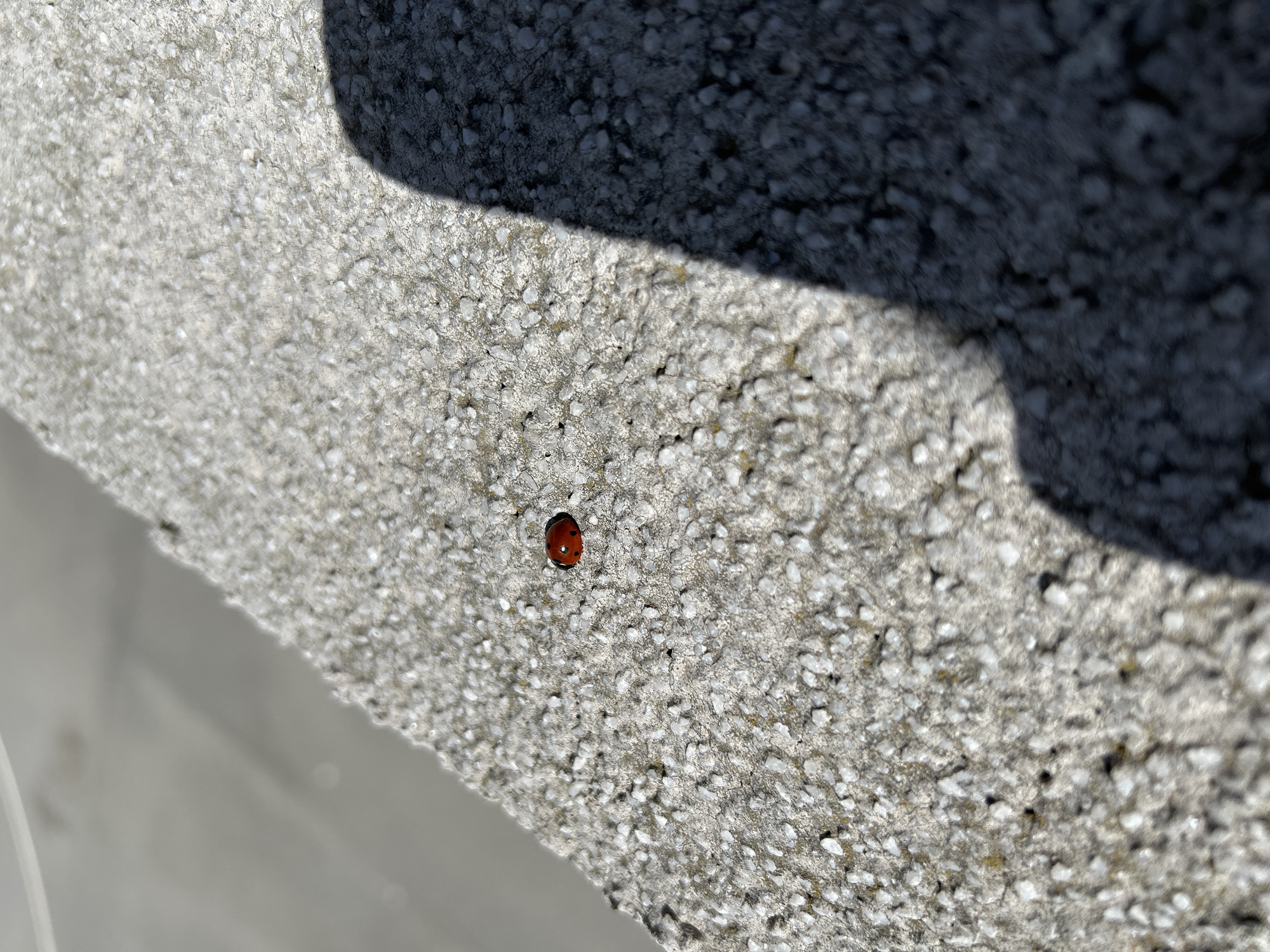 A ladybug rests on a textured gray surface, partially shaded by an unidentified dark object