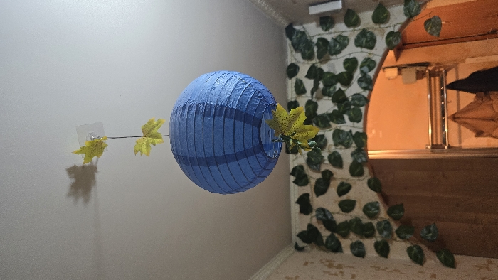 The image depicts an indoor scene located in Bishkek City, Kyrgyzstan. A blue, spherical paper lantern with alternating light and dark blue vertical stripes hangs centrally from a white ceiling. The lantern is suspended by a string attached to a transparent adhesive hook. Three artificial yellow maple leaves are interspersed along the suspension string, with two above the lantern and one below. Shadows of the upper leaves are cast onto the white ceiling. Below the lantern, an arched doorway or opening is visible, leading into an adjacent room. This archway is decorated with a garland of artificial dark green leaves. The room beyond the archway is dimly lit with a warm, orange glow. Within this opening, a metallic rack with hooks is mounted, from which two garments, one light-colored and one dark-colored, are observed hanging. A small, white rectangular fixture is attached to the wall on the right side of the archway. No individuals or active subjects are present in the scene.