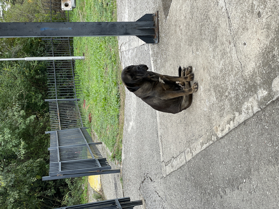 - "An outdoor scene in Danilovgrad, Montenegro, displays a large, dark-brown brindle dog, consistent with a Mastiff-type breed, seated on a light gray concrete slab in the mid-ground" by FM-GgSpJ3, licensed under CC BY 4.0