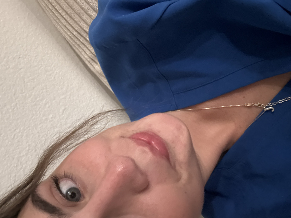 A woman’s selfie, angled, shows her face from below. She has fair skin, light brown hair, and blue eyes. She wears a shiny lip gloss. A delicate silver chain necklace with a “J” pendant adorns her neck. She is wearing a royal blue top, possibly scrubs. Behind her is a white wall and a beige upholstered headboard or couch. The photo is slightly blurry.