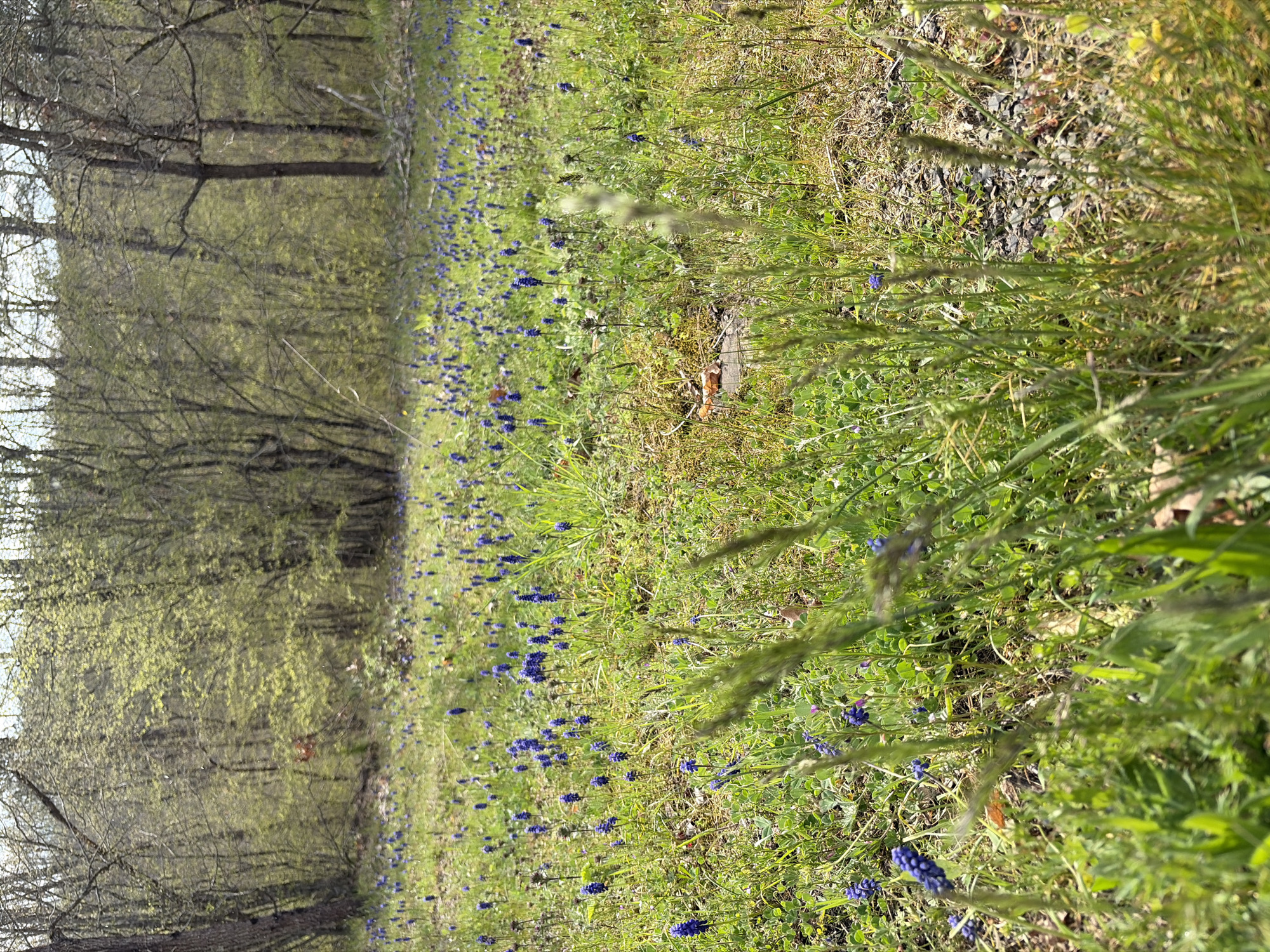 landscape, likely in a natural environment, with trees on the left and a field of grass and small blue flowers dominating the scene