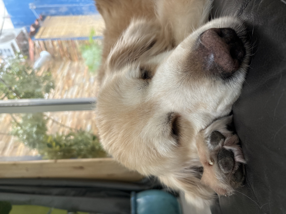 - "A light golden retriever dog is depicted in a close-up, resting its head on its right front paw, eyes closed in sleep" by FM-wE9nL2, licensed under CC BY 4.0