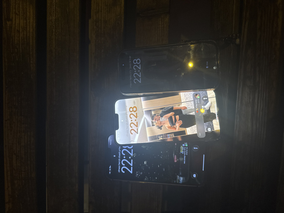 The image depicts an indoor scene within the city of Azor, Israel. Three smartphones are displayed horizontally on a dark, horizontally slatted wooden surface. The ambient lighting is dim, with light primarily emanating from the phone screens. From left to right: 1. The leftmost smartphone displays a lock screen with the time "22:28" in white text, accompanied by Hebrew text above and below. A "5G" network indicator is visible. The background image is dark and indistinct, showing faint reflections. 2. The central smartphone, brightly illuminated, displays a lock screen with the time "22:28" in orange text. Its wallpaper is a mirror selfie showing a female in a black two-piece outfit holding a phone, standing alongside a male in a dark top and light pants. They are positioned in an area with vertical light wood paneling, likely an elevator or mirrored room. A Hebrew notification bubble is present at the bottom of the screen. A "5G" network indicator is visible. 3. The rightmost smartphone displays a lock screen with the time "22:28" in white text, with Hebrew text above. A "5G" network indicator is visible. The background is predominantly dark, featuring a circular yellow reflection near the bottom center. All three phones display the identical time of "22:28". No direct human presence or interaction is observed within the immediate environment of the phones; the only people depicted are within the wallpaper image on the central phone.