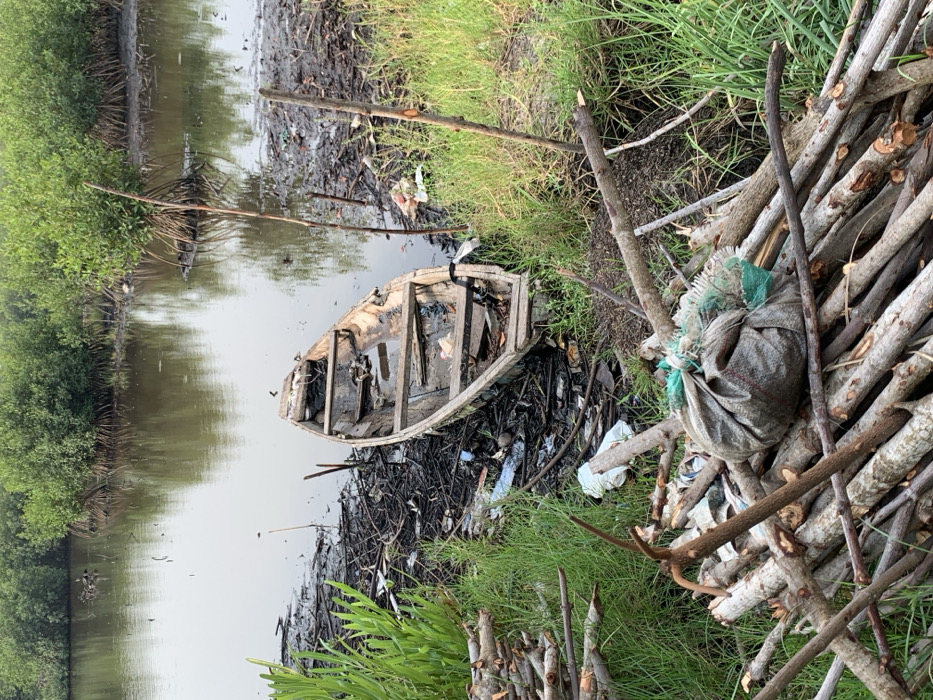 The image depicts a polluted waterway or canal in Ibasa, Nigeria. A dilapidated, light-colored wooden dugout canoe, approximately 3-4 meters long, rests partially submerged on the muddy bank in the mid-ground. The boat's interior is visible and contains various pieces of trash. The immediate shoreline around the boat is heavily contaminated with black, oily residue and an accumulation of refuse, including plastic bags and debris. Beyond the boat, the murky, reflective water body extends, bordered by a dense line of lush green mangrove trees whose roots are visible along the far bank. Several thin wooden stakes are embedded vertically in the muddy near bank. In the foreground, a large pile of cut wooden branches or logs is stacked on a grassy area to the left and center. On top of this pile, a grey woven sack, partially covered by a green mesh bag, is present. The overall environment shows signs of both natural vegetation and significant human-induced pollution. No people or animals are visible.