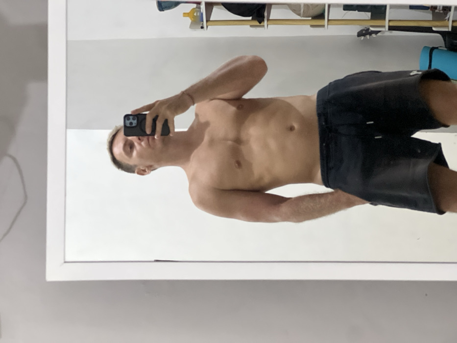 An adult male stands in a room in Celuk, Indonesia, taking a mirror selfie. He has light skin, short blond hair, and stubble. The man is shirtless, displaying a muscular torso, and wears black athletic shorts with a white drawstring. His left hand holds a dark-colored smartphone, obscuring the lower half of his face, while his right hand is partially inserted into the pocket of his shorts. A thin, red beaded bracelet is visible on his left wrist. The central subject is reflected in a rectangular mirror with a white frame. To the left of the mirror, a plain grey wall is visible. Reflected to the right of the subject is a white wall and a light-colored multi-tiered shelf unit. The top shelf contains a small yellow object and a teal container. A black garment or bag is on the shelf below, followed by a light-colored spherical object and the headstock of a guitar. A rolled teal object, possibly a yoga mat, is visible on the floor in the bottom right of the reflection.