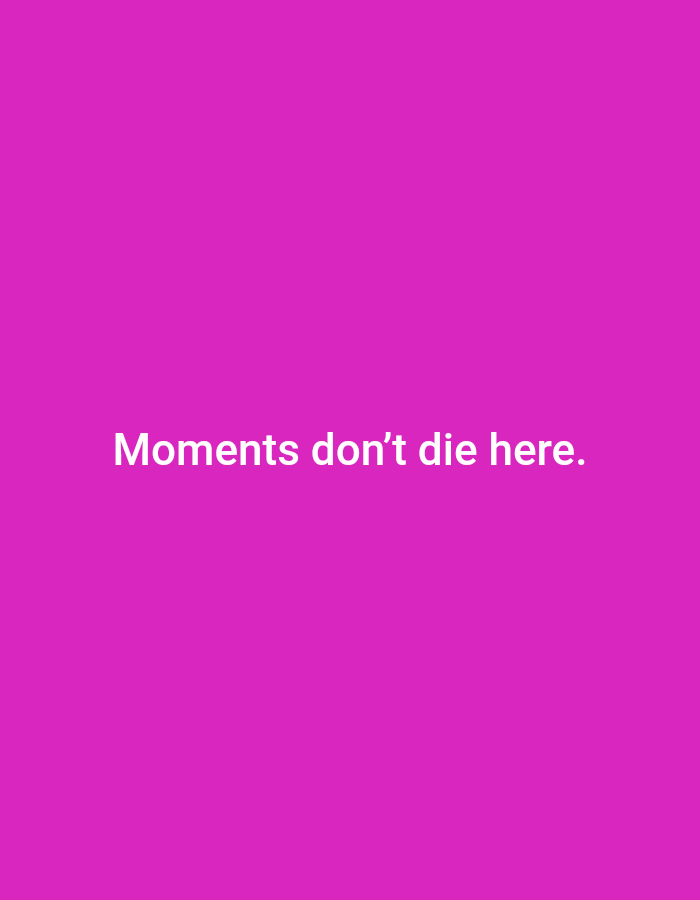 The image is a solid pink background with the text "Moments don't die here" in white, centered in the bottom half of the image